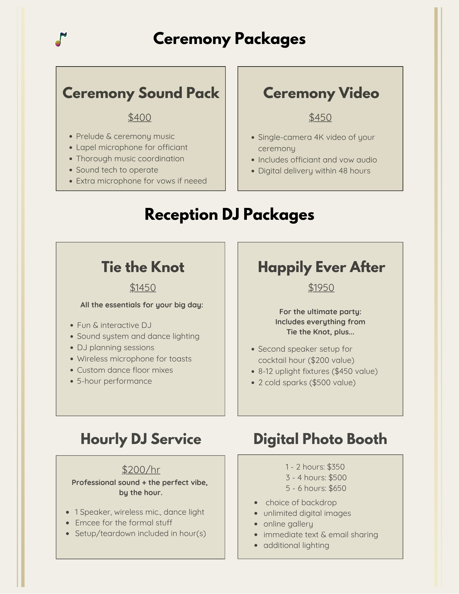 “Every wedding is different — let’s build the right package for your vision.”